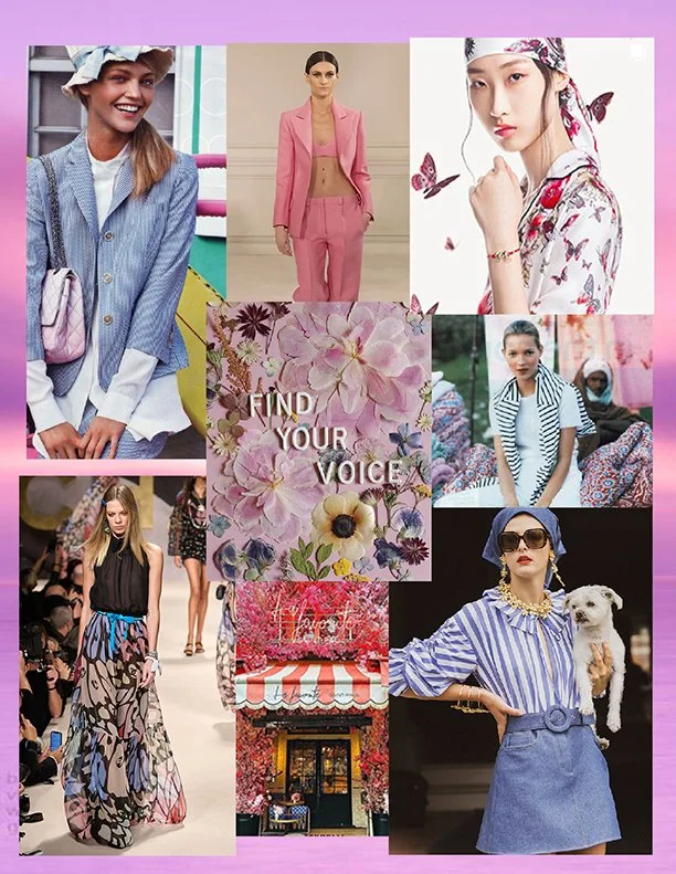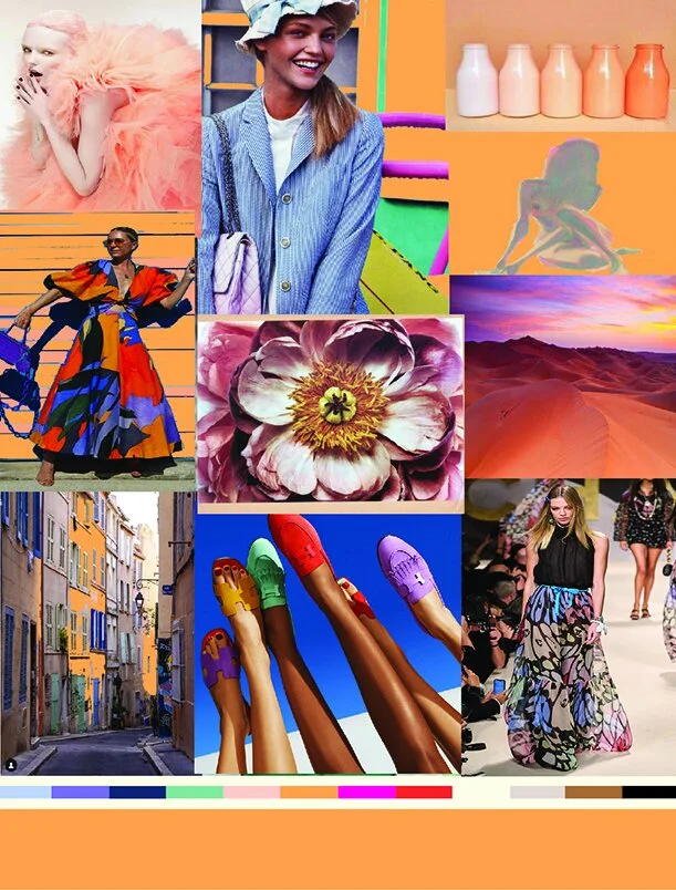 Apricot is the key color, Pale and Denim Blue, Pale Pink, with pops of Tomato Red and Hot Pink. Pale Beige and Saddle Brown to round out the palette.